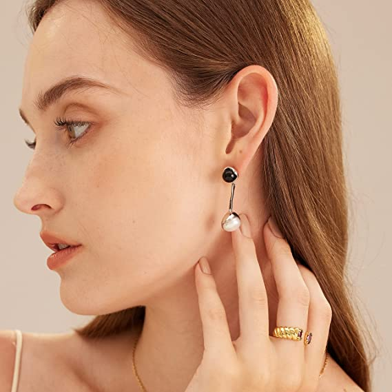 GOLD-PLATED: This drop earring showcase perfectly rounded pearls and agate, which are joined together 18k white gold links for an elegant style.
